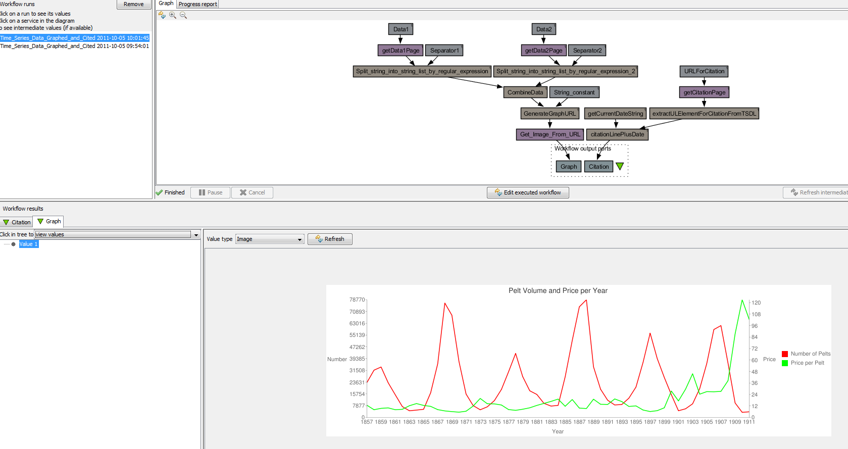 This workflow uses time series data from Rob Hyndman's Time Series Data Library (TSDL) and graphs it with Google charts. It also provides the citation information with the current date. The outputs are a Google Chart and the corresponding citation information. The inputs are URL strings for two datasets provided by Rob Hyndman under the subject of Ecology. These datasets include the annual number of lynx pelts and the annual unit price of lynx pelts during the year range 1857 -1911. This...