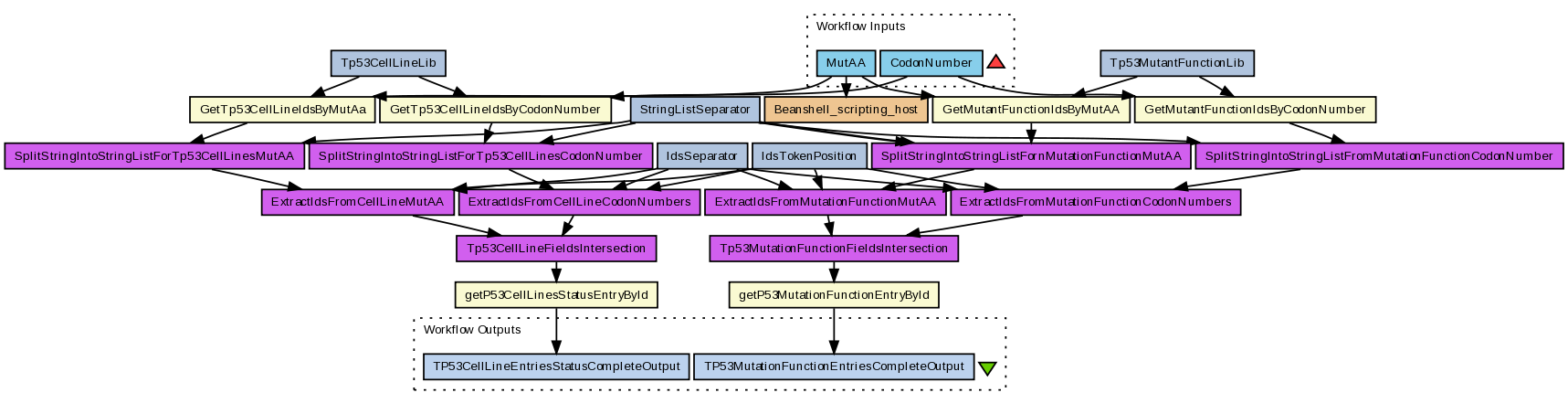 This workflow retrieves from two different databases two distinct set of entries starting from the same inputs data (i.e. the Mutated Aminoacid encoded at the codon in which the mutation occurred, and the Codon Number where the mutation occurs). Input data: Mutant Amino Acid encoded at the codon in which the mutation occurred and Codon Number where the mutation is located. Special requirements on input data are: - the MutAA (Mutated Amino Acid) in three letters code (Gly, Ala, Trp, Phe etc.) - the Codon Number range is 1-393, - other values may lead to errors, - when specifying more than one MutAA or Codon Number, they must be in a unique input string but on distinct text lines