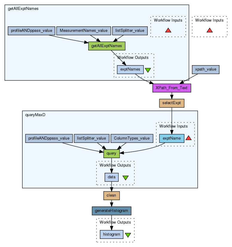 This workflow retrieves data from the MaxD microarray database and calculates the frequencies of gene expression levels using an R script