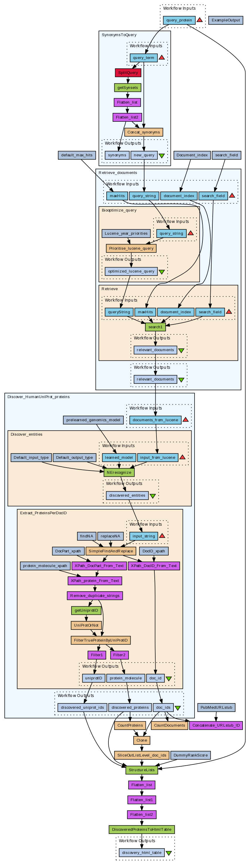 - Discover proteins: extract proteins discovered in the set of relevant abstracts with a 'named entity recognizer' trained on genomic terms using a Bayesian approach; the AIDA service inside is based on LingPipe. This subworkflow also 'filters' false positives from the discovered protein by requiring a discovery has a valid UniProt ID. Martijn Schuemie's service to do that contains only human UniProt IDs, which is why this workflow only works for human proteins.