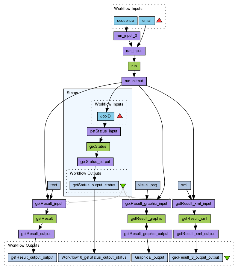 This workflow performs an interproscan at the EBI on sequences provided as input. The output is provided as text, xml or png. This workflow uses the new EBI services, which are asynchronous and require looping over the nested workflow (Status) until the workflow has finished. Many of the EBI services now work in this way, so you can use this workflow as an example of the invocation pattern and looping configuration.