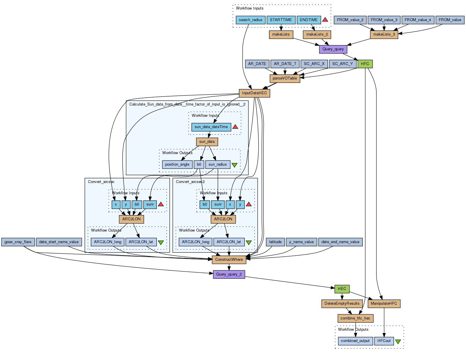 This workflow is querying the HFC ActiveRegions list and HEC goes_xray_flare list. It requires a time periode and a search radius arround the centre of an Active Region as inputs It produces two outputs: HFCout is a modified VOTable where a field is added with the number of associated hessi flares. combined_output is a 2 dimensional list with an VOTable for each Active region and one with an VOTable for all associated flares for that Active Region.