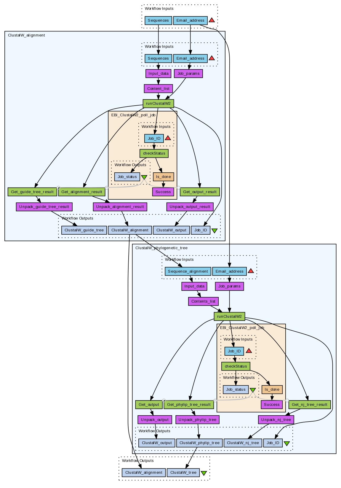 Given a set of sequences perform an multiple sequence alignment and from the multiple alignment derive a phylogenetic tree. The popular ClustalW program (see http://www.clustal.org/), as implemented in the EBI's WSClustalW2 service (see http://www.ebi.ac.uk/Tools/webservices/services/clustalw2) is used to perform both tasks.
