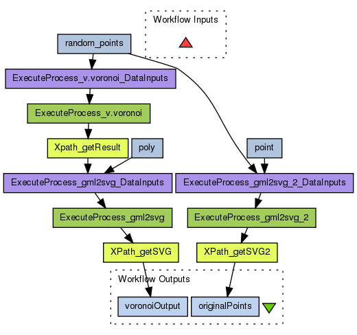 A random point file in GML 2.1.2 is sent to the v.voronoi service and after it is sent to a service that runs v.out.svg generating a SVG image that can be rendered in Taverna (need to set output to SVG image)