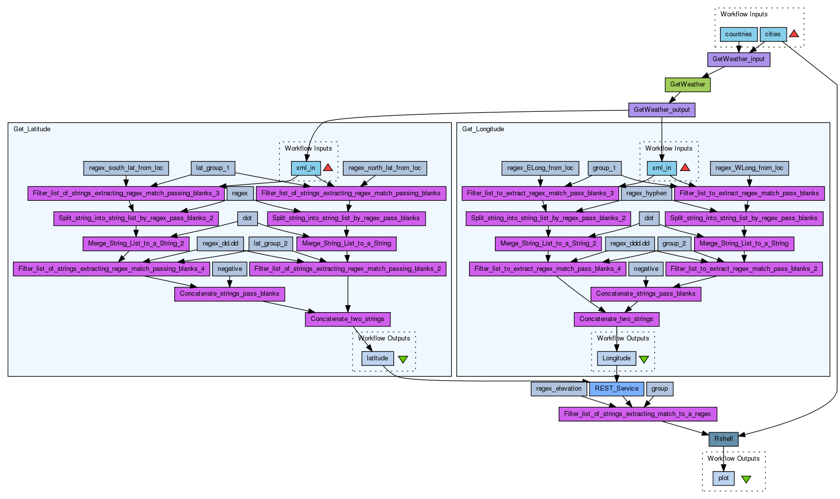 The XML returned from GetWeather is then searched using regular expressions for the geogrpahic coordinates. Because the coordinates are returned in a different format (with a hyphen) than is required for the next web service (with a period), a lot string-wrangling needs to happen in order to format the coordinates as is needed while not loosing values along the way. All of this happens in the two additional workflows embedded in the main workflow, and which have been uploaded with the titles "latitudewithbeans" and longitudewithbeans". The names reference the fact that in each workflow netbeans scripts had to be edited in order to produce the required output.