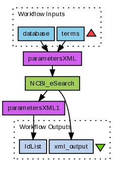 This workflow takes in a search term and a database (e.g. snp, gene, protein) in which to perfom the search over. The result is an xml file containing summary information about the search term.