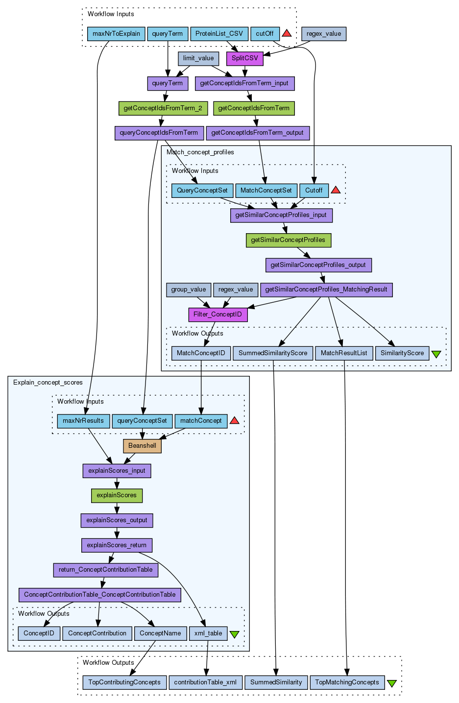This workflow computes the match between a list of proteins and a term of interest by means of concept profile matching (Jelier et al., van Haagen et al.). The result of this is a list of concepts ordered by their matching score (the length of the list set by maxMatchNr). Of this list the summed scores are explained by computing the concepts that contribute most to the combination of the matching protein and the query term. E.g. (by analogy) when a group of informaticians is matched against biology, the informaticians working in biology may be ranked on top, while the most enriched concept among such an informatician and biology may be 'bioinformatics'.