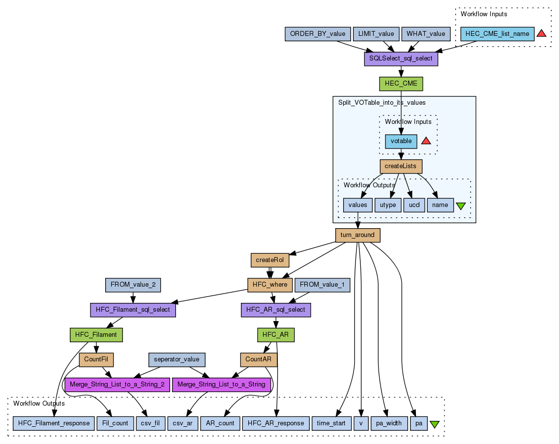 This workflow is querying the HEC for the fastest 100 CME of a given list (input parameter); it calculates the latitude from the postion angle; last step is to query the HFC for Active Regions and Filaments for the given time where the bounding box of the feature contains the longitude (feature must be on the correct side of the Sun.)