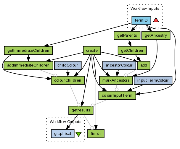 This workflow builds up a subgraph of the Gene Ontology (http://www.geneontology.org) to show the context for a supplied term or terms. It shows this context by colouring all ancestors of the term, all children and all siblings. By default, ancestors of the supplied term or terms are coloured orange, siblings purple and direct children teal. Other terms appear in the default wheat colour.