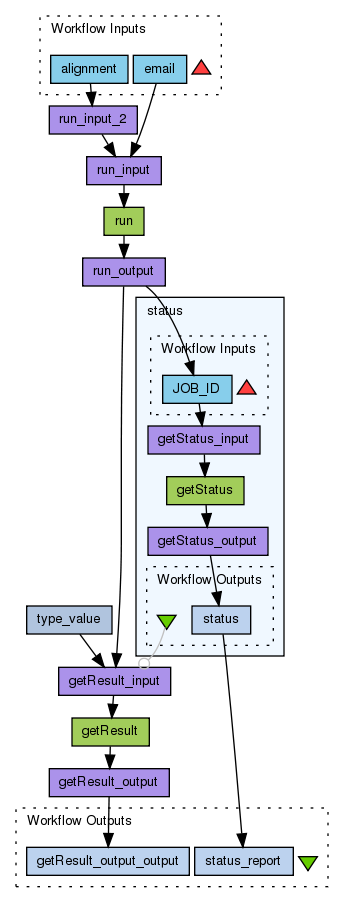 This workflow accepts a ClustalW protein sequence alignment and produces a phylogenetic tree, using the EBI clustalw_phylogeny web service, which implements phylip.