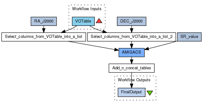 Snippet showing how to use AstroTaverna "VO service perspective" and other tools for performing Multi-ConeSearch queries to a VO Services. The input is a VOTable with a list of source names and coordinates to perform the multi-query. Please *note how the AMIGACS block list handling is cofigured* with right click -> Configure running -> List Handling. Add_n_concat_tables tool is used to concatenate the list of responses issued from the multiquery. The result is a VOTable that may be renderized properly in the perspective Results, coosing Value Type as VOTable.