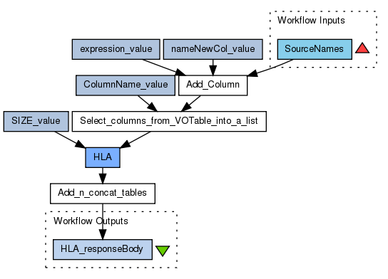 Snippet showing how to use AstroTaverna "VO service perspective" and other tools for performing Multi-SIA queries to Image VO Services. The input is a VOTable with a list of source names and coordinates to perform the multi-query. Add_n_concat_tables tool is used to concatenate the list of responses issued from the multiquery. The result is a VOTable that may be renderized properly in the perspective Results, choosing Value Type as VOTable. It may also be sent via SAMP to other VO soft implementing SAMP. In this particular case, the Image Service queried is the "The Hubble Space Telecope Legacy Archive (HLA)"