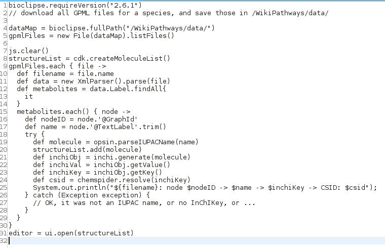 This scripts parses a directory with WikiPathways GPML files. For each "label" it checks if the label contains an IUPAC name (using OPSIN), calculated the InChIKey (using JNI-InChI/CDK), and looks up a ChemSpider identifiers (using the ChemSpider web service).