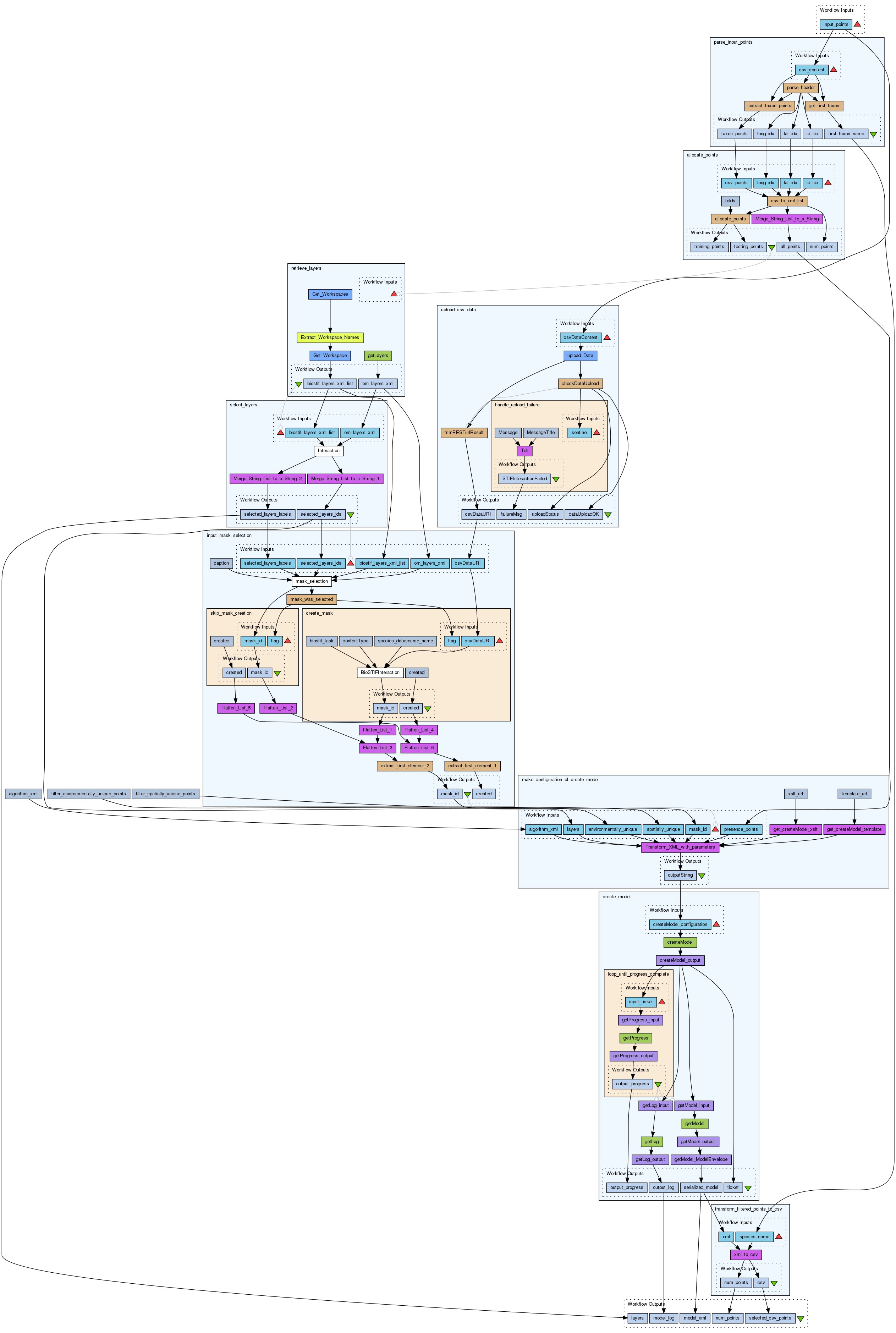 This workflow takes as input a file containing species occurrence points to create a model with the openModeller Web Service using the Bioclim algorithm. Environmental layers and mask are selected during the workflow. Points are filtered so that only environmentally unique points are used to create the model.
