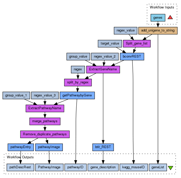 This workflow accepts a list of Unigene gene identifiers and returns descriptions of gene functions and a list of all pathways each gene is involved in (plus pathway image) from the KEGG database.