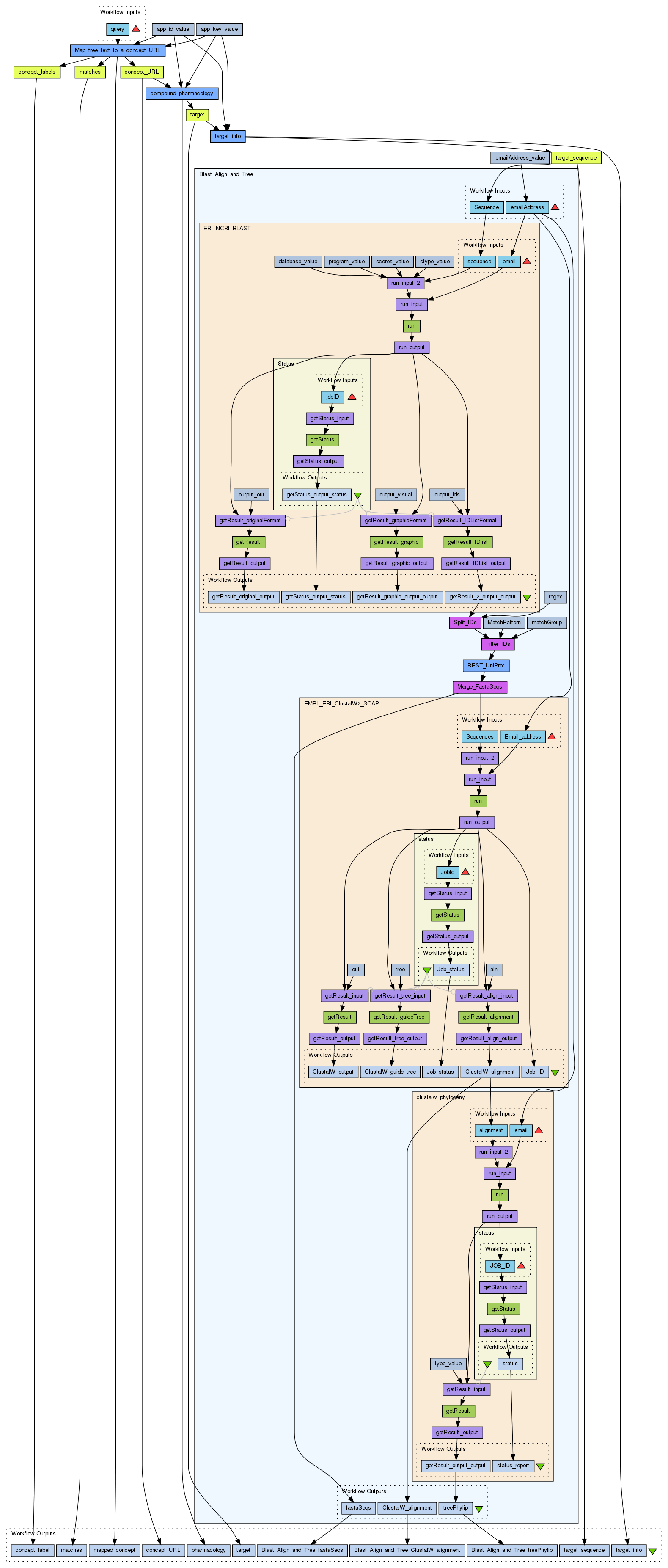 Uses the Open PHACTs API https://dev.openphacts.org/docs/alpha and the myExperiment workflow 3369 "Blast_Align_and_Tree" http://www.myexperiment.org/workflows/3369.