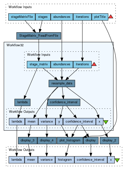 The Parametric Bootstrap or Resample a projection matrix Workflow provides an environment to resample a projection matrix using a multinomial distribution for transitions and a log normal distribution for fertilities (Stubben, Milligan, and Nantel. 2011). The resample is based on number of plants surveyed. The projection matrix A is first split into separate transition and fertility matrices. Dead fates are added to the transition matrix and the columns are then sampled from a Multinomial distribution based on the size in each corresponding stage class in n. The fertility rates are sample from a Log Normal distribution using the lnorms function. The same variance is applied to all rates by default. (Stubben, Milligan and Nantel 2013, Caswell 2001 see section 12.1.5.2).