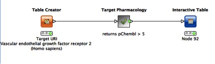 In the Open PHACTS project, we have developed KNIME utility nodes that can be set to automatically leverage the desired content from Open PHACTS web services and simplify the construction of workflow processes. In this workflow we use the these KNIME nodes (which can be down loaded here: https://github.com/openphacts/OPS-Knime ) with the Open PHACTS API call Target Pharmacology and filter minEx-pChembl=5 to answer scientific competency question Q7; For a target, give me all active compounds with the relevant assay data, and Q17: For my specific target, which active compounds have been reported in the literature?