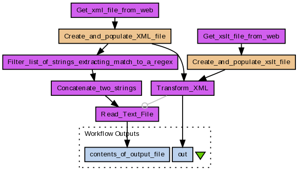 To check the content of the output file, its file path is calculated by calls of Filter_list_of_strings_extracting_match_to_a_regex and Concatenate_two_strings. The file path is passed to the Read_Text_File service. Once the Transform_XML service has finished, the Read_Text_File service reads the output file and echoes its content to the contents_of_output_file port of the workflow.