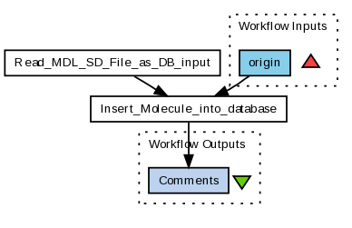 This workflow load molecules into a database. The molecules originally are stored in a MDL SD file. As workflow input an origin is added to each molecule which gets stored into the database. The output of the workflow shows logs from the database insert process.