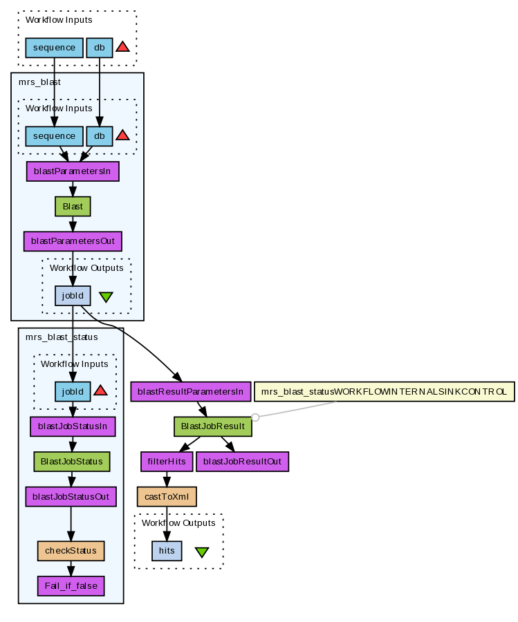 This blastp workflow uses the blast service of MRS (http://mrs.cmbi.ru.nl). Inputs are a sequence (only amino acids, not a fasta sequence) and a database name. Valid database names that can be used are "sprot", "uniprot", "trembl", "pdb", "refseq", "ipi" and "gpcrdb". Output is returned in XML.