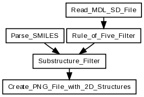 It then performs a substructure query, represented as SMILES (change the default value on Parse_SMILES), on the structures that pass Lipinski, and creates PNG images of those structures that contain the substructure.