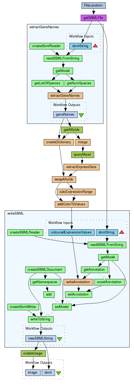 This workflow maps microarray data onto metabolic pathway diagrams represented as SBML models drawn using Cell Designer. To run this workflow requires libsbml to be installed into taverna - see http://www.mcisb.org/software/taverna/libsbml/index.html