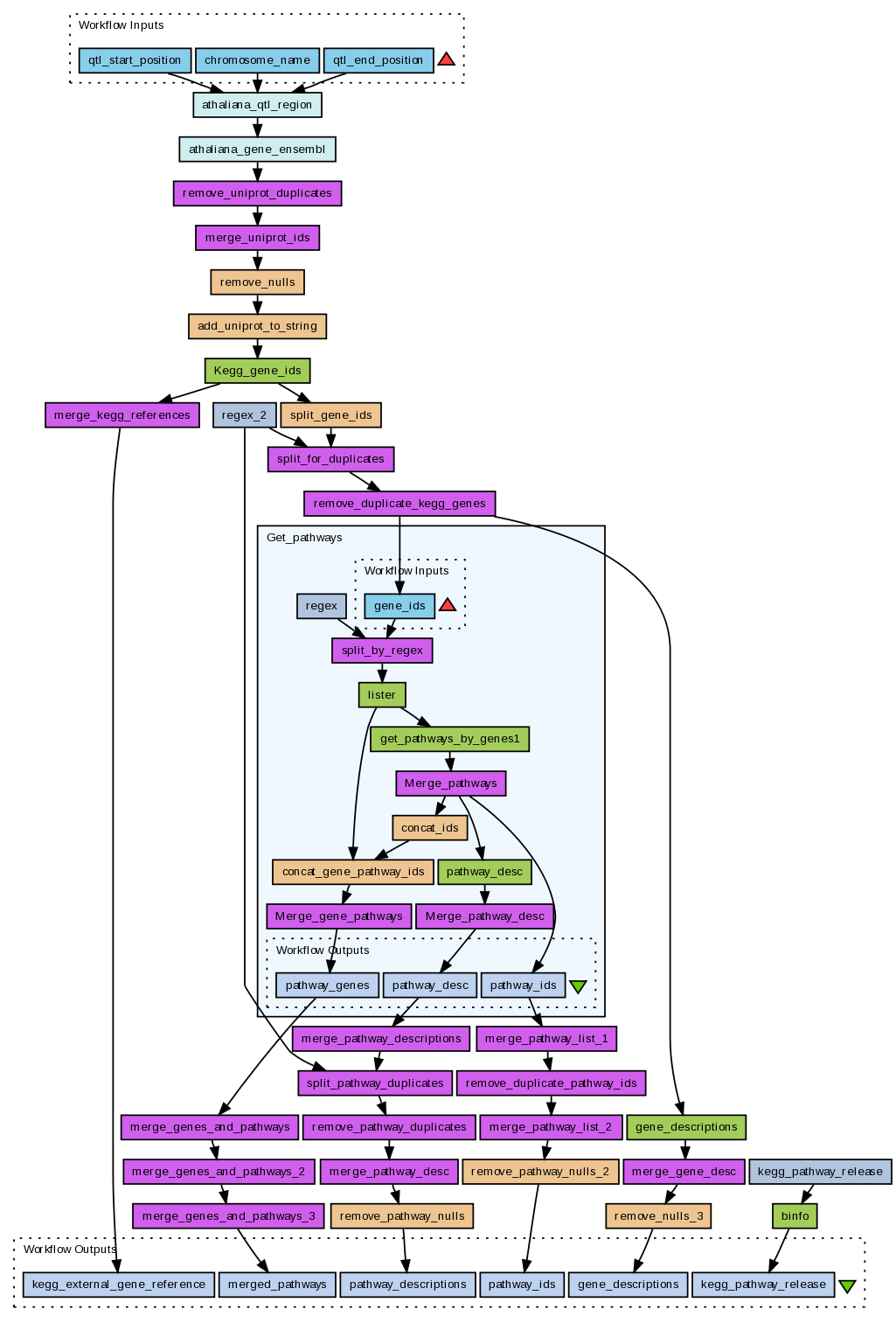 This workflow searches for genes which reside in a QTL (Quantitative Trait Loci) region in Arabidopsis thaliana. The workflow requires an input of: a chromosome name or number; a QTL start base pair position; QTL end base pair position. Data is then extracted from BioMart to annotate each of the genes found in this region. The UniProt identifiers are then sent to KEGG to obtain KEGG gene identifiers. The KEGG gene identifiers are then used to searcg for pathways in the KEGG pathway database.