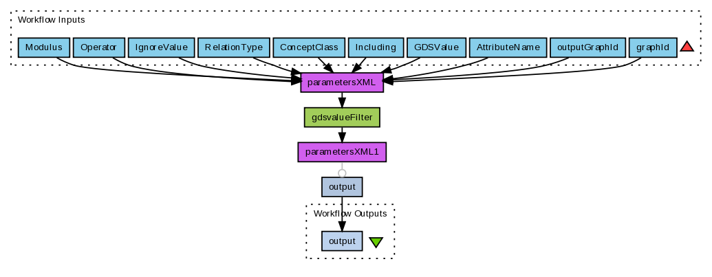 graphId - the ID of the input Graph. outputGraphId - the ID of the output Graph. Optional parameter. If no output graph is specified filtered items will be removed from the input graph. AttributeName - AttributeName to filter out. GDSValue - A value which will be matched against the GDSs. Including - If true keep only concepts/relations that have GDS value or dont have the GDS at all. If false remove concepts that have GDS value. Default value is true. Valid values are [true, false]. ConceptClass - ConceptClass to filter within (only concepts within this class will be removed): default = all. (Optional) RelationType - RelationType to filter within (only relations connected with this type will be removed): default = all (Optional) IgnoreValue - Removes concepts/relations that dont have the AttributeName (Optional) Default value is false. Valid values are [true, false]. Operator - A operator that will be used in conjuction with the gds value to determine if the object should be kept or not e.g. (>,<,=,<=,>=) NB mathmatical operators that are not "=" are only evaluated on Number Objects, all else will be false. i.e. "a" >= "b" is false but "a" >= "a" is true. Optional parameter. Default value is =. Modulus - Treat values as modulus in comparison (Optional) - boolean