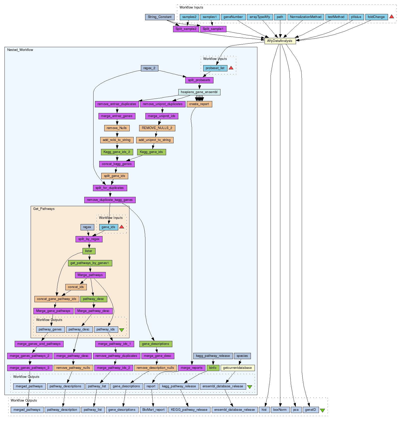 This workflow takes in a CEL file and a normalisation method then returns a series of images/graphs which represent the same output obtained using the MADAT software package (MicroArray Data Analysis Tool) [http://www.bioinf.manchester.ac.uk/MADAT/index.html]. Also retruned by this workflow are a list of the top differentialy expressed genes (size dependant on the number specified as input - geneNumber), which are then used to find the candidate pathways which may be influencing the observed changes in the microarray data. By identifying the candidate pathways, more detailed insights into the gene expression data can be obtained.