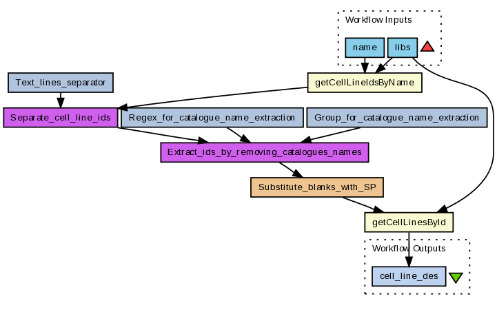 This workflow takes the cell line name and the catalogue(s) name(s) as input and retrieve the full cell line description(s) by first retrieving the cell lines' unique IDs associated with the input (done via a call to the getCellLineIdsByName web service) and then using IDs for retrieving the full cell lines descriptions (done via a call to the getCellLinesByIds web service).