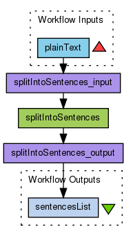 This workflow will attempt to split up text into sentences, returning a list of sentences to the output port. The sentence splitting service makes use of the OpenNLP sentence detector and has been trained to work on english text. This workflow can be used to provide input to the Termine with c-value threshold workflow.