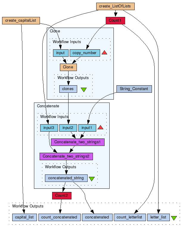 In this implementation a java beanshell is used to clone the items in list 2 as many times per item as there are items in the sublists of list 3. The iteration strategy for Clone is set to a dot product. Thus a count on list 2 produces: [2,2,2] Clone with input: [2,2,2] . [A,B,C] produces [[A,A],[B,B],[C,C]] (note the dot product) (4) Then concatenation of (1)*((4).(3)) produces: [[1Aa,1Ab],[1Bc,1Bd],[1Ce,1Cf]]
