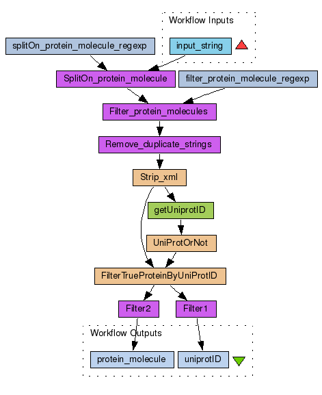 This workflow filters protein_molecule-labeled terms from an input string(list). The result is a tagged list of proteins (disregarding false positives in the input).