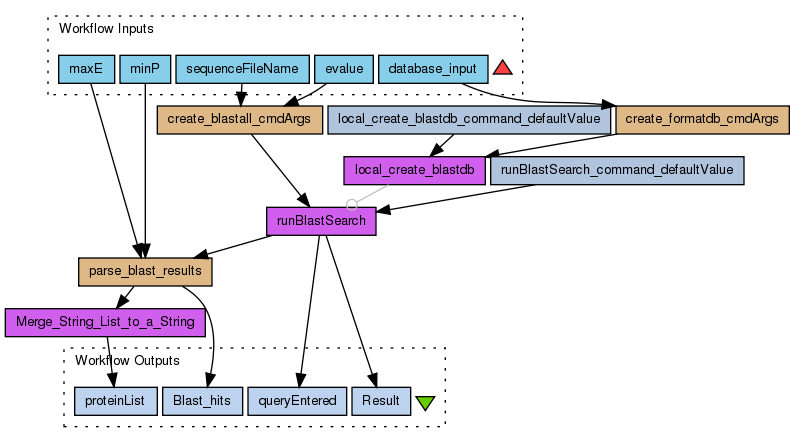 Warning: This workflow assumes that you have blastall and formatdb installed on the machine, and that by default, these are both found or linked in /usr/local/bin. It also assumes that you have write permission to the directory you have run taverna from. The beanshells "create_blastall_cmdArgs" and "create_formatdb_cmdArgs" are what you need to edit if the default locations are not appropriate for you.
