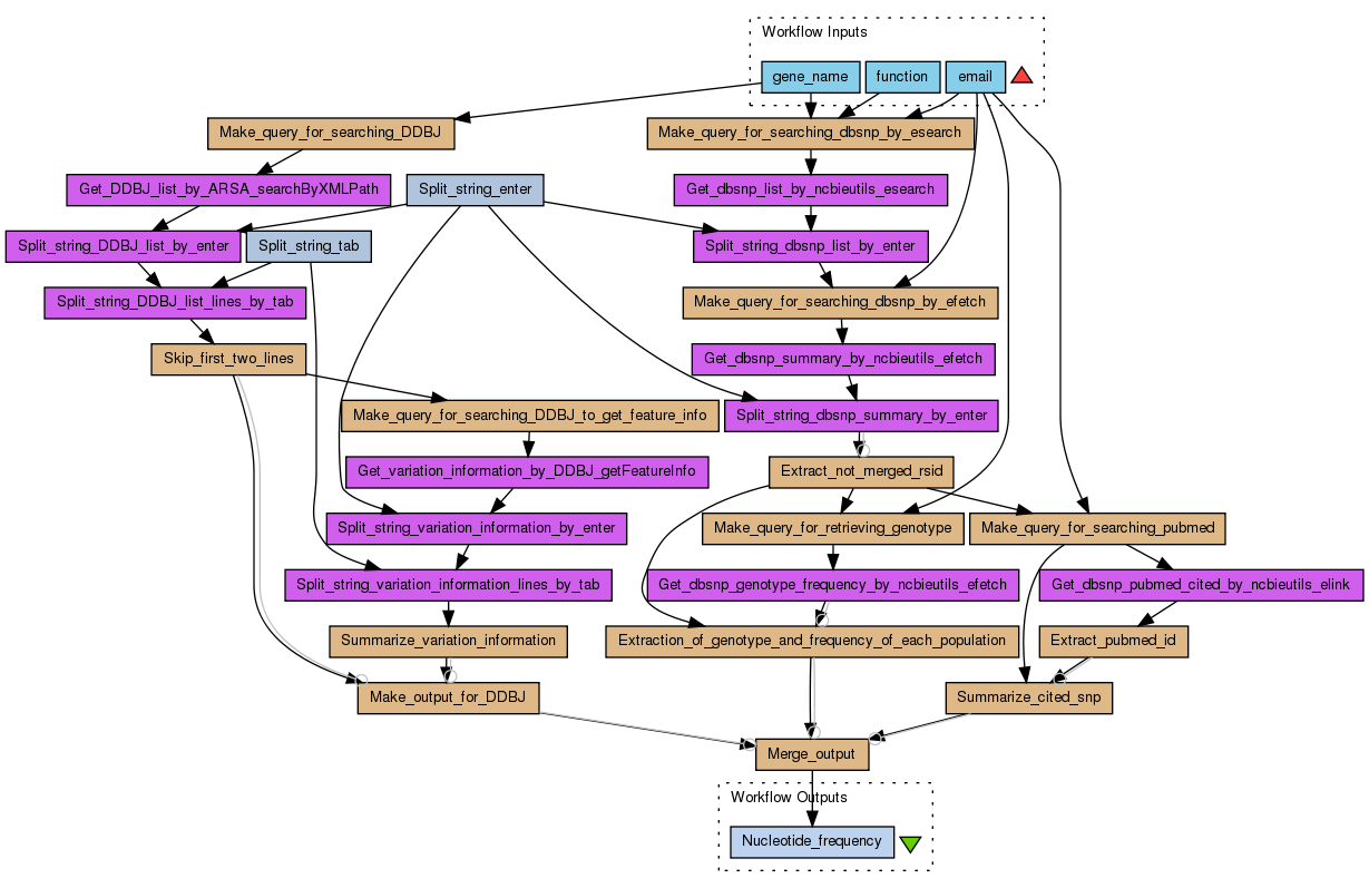ALDH2 gene encodes enzyme which transform from acetaldehyde to acetic acid. It is known that variation of one DNA weakens the function. It is said that there are a lot of people who have the gene of such a type in Asia including Japan. However there are few people of such type of the gene in Europe or America. Therefore this workflow verifies that how type of the gene is distributed among Asian and Europe or America by using DDBJ and dbSNP data.