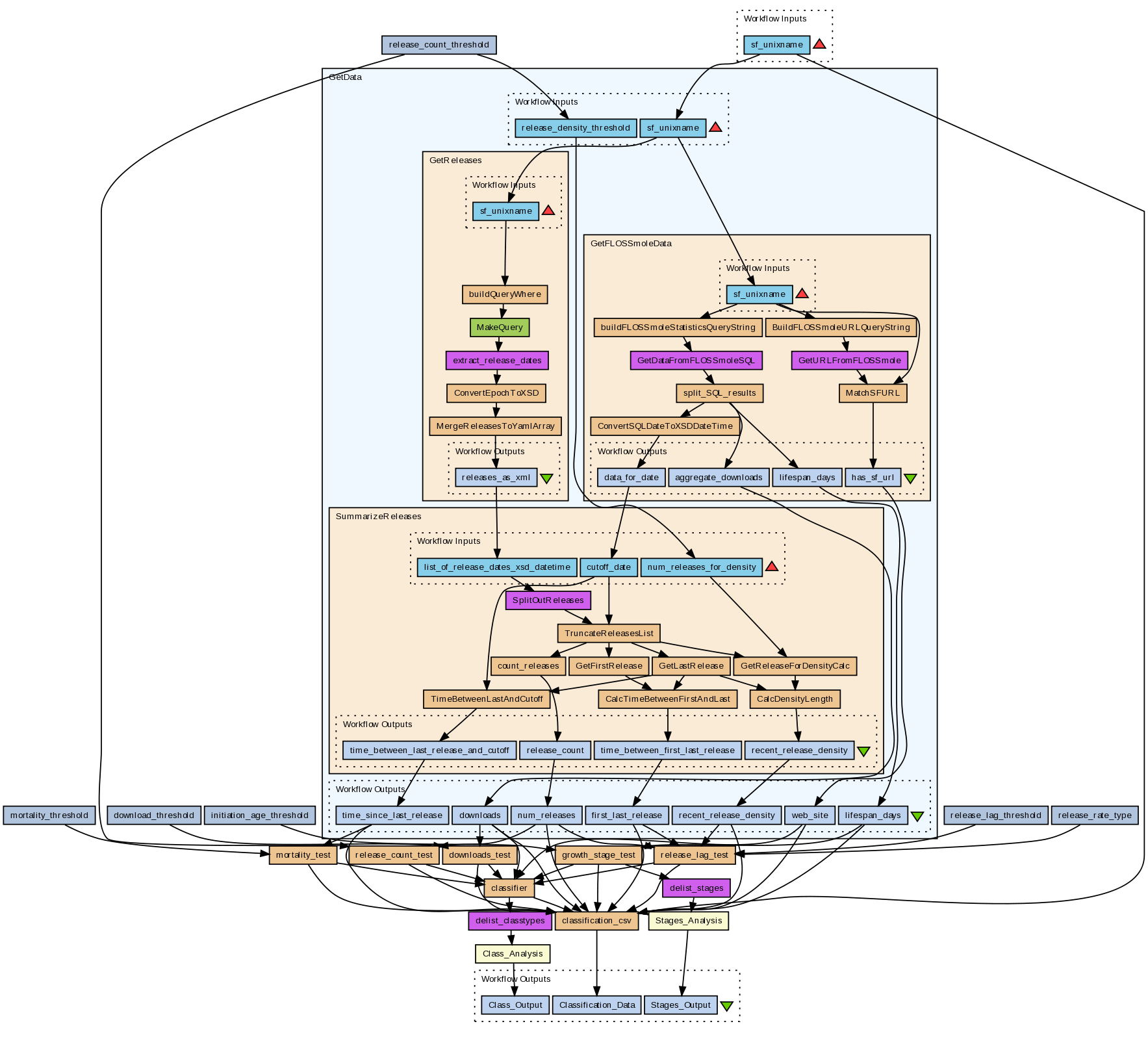 GetData | workflow | Author: James Howison Procedure to fetch data from FLOSSmole and the Notre Dame SourceForge dumps based on the SourceForge unixname for a given project. Input is a list of project SourceForge unixnames, and a threshold value for the "recent release density" value. Not currently suited for running large batches of projects. |