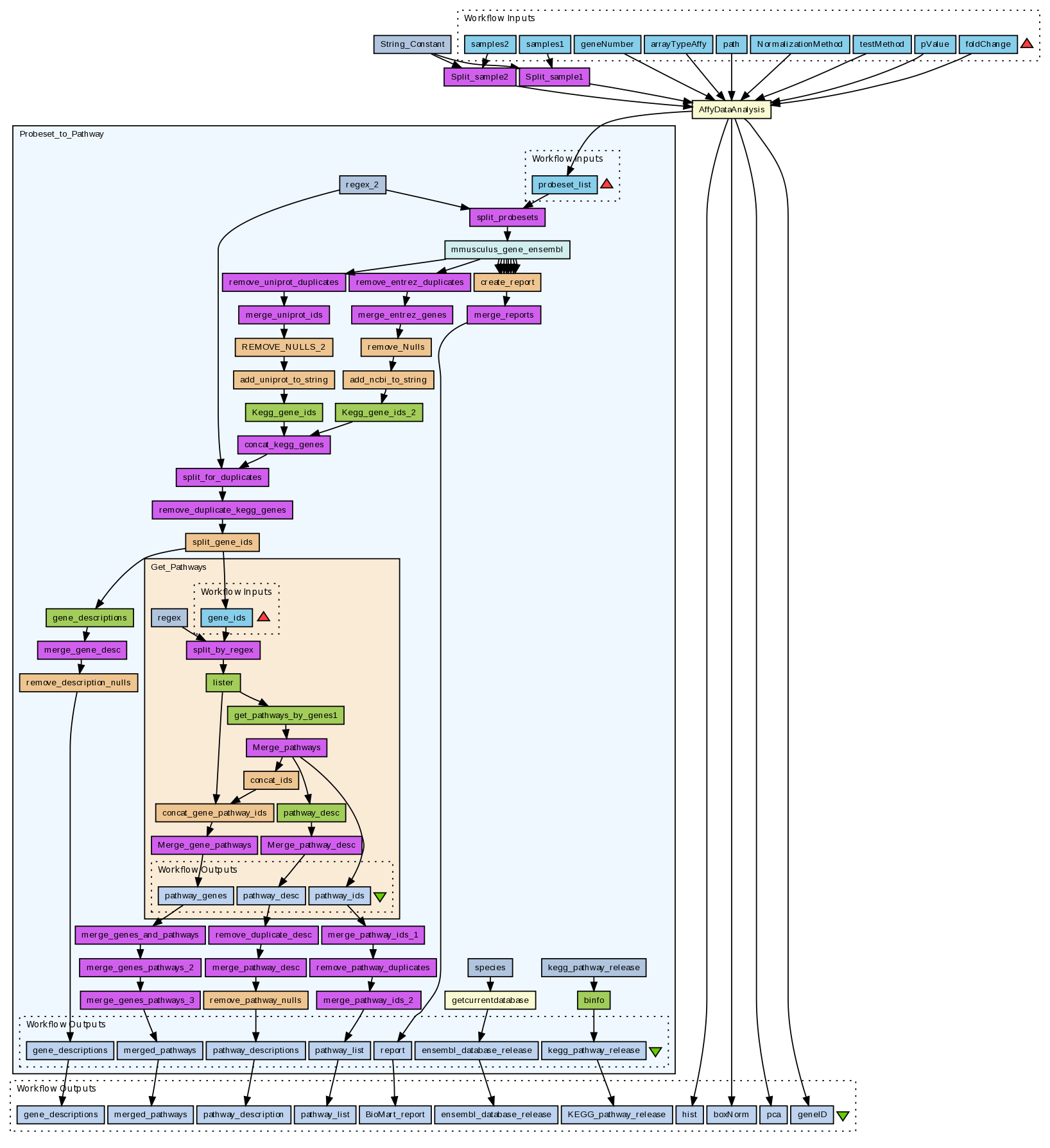 The example inputs for this workflow are as follows: Samples1 = one or more CEL files for cross-correlating with Samples2 CEL files (new line separated): Liver_Day1_Mouse.CEL Liver_Day2_Mouse.CEL Samples2 = one or more CEL files for cross-correlating with Samples1 CEL files (new line separated): Kideny_Day1_Mouse.CEL Kidney_Day2_Mouse.CEL geneNumber = the number of differentialy expressed gene to be returned above a given p-value, e.g. 20 arrayTypeAffy = the name of the Mouse AffyMetrix array used, e.g. mouse4302 path = the direct path to the CEL file location, e.g. C:\Microarray_Data\CEL_FILES\ - note the forward slashes NormalizationMethod = the type of normalisation to perfrom, e.g. rma, gcrma or mmgmos testMethod = e.g. limma, mmtest or pplr p-value = the p-value cut-off value for the array data, e.g. 0.05 foldChange = the fold change value for the microarray data, e.g. 1 (means greater than 1 or less than -1)
