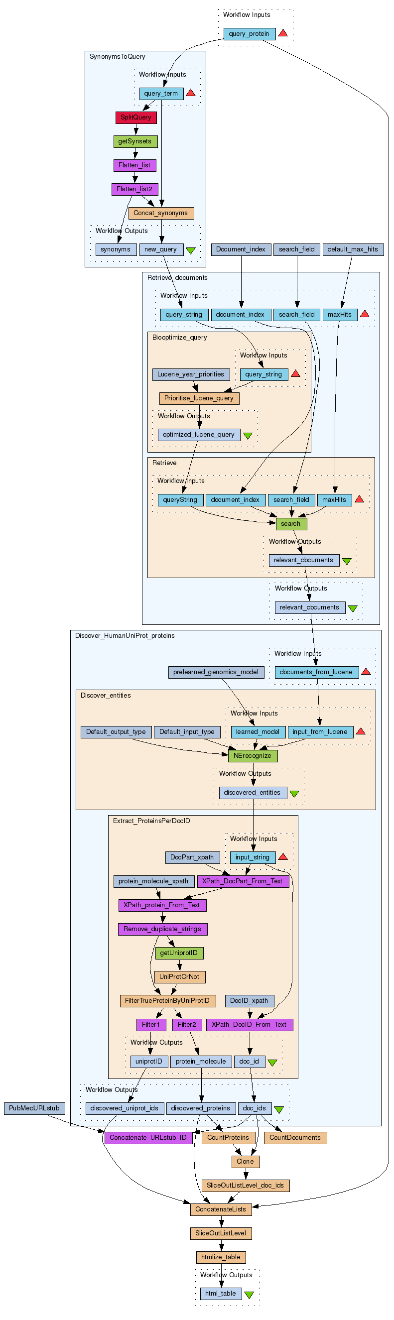 - Discover proteins: extract proteins discovered in the set of relevant abstracts with a 'named entity recognizer' trained on genomic terms using a Bayesian approach; the AIDA service inside is based on LingPipe. This subworkflow also 'filters' false positives from the discovered protein by requiring a discovery has a valid UniProt ID. Martijn Schuemie's service to do that contains only human UniProt IDs, which is why this workflow only works for human proteins.
