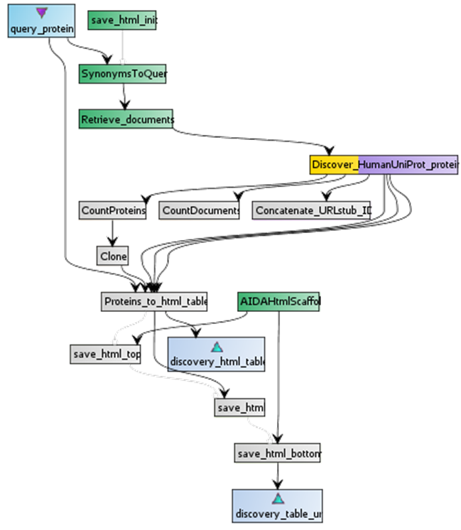 This workflow was based on BioAID_DiseaseDiscovery, changes: expects only one protein name, adds protein synonyms). This workflow finds diseases relevant to the query string via the following steps: A user query: a single protein name Add synonyms (service courtesy of Martijn Scheumie, Erasmus University Rotterdam) Retrieve documents: finds relevant documents (abstract+title) based on query Discover proteins: extract proteins discovered in the set of relevant abstracts 5. Link proteins ...