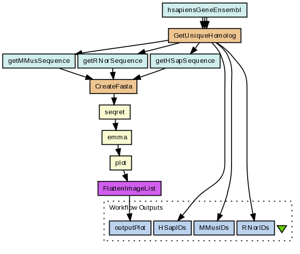 Using Biomart and EMBOSS soaplab services, This workflow retrieves a number of sequences from 3 species: mouse, human, rat; align them, and returns a plot of the alignment result. Corresponding sequence ids are also returned.