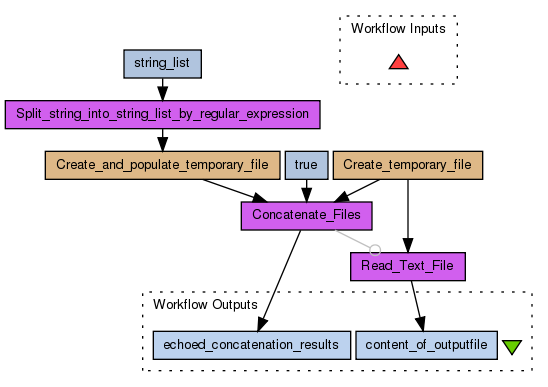 The split_string_into_string_list_by_regular_expresson outputs an empty list since the string to be split is defaulted to ''. As there are no input values, the create_and_populate_temporary_file generates an empty list.