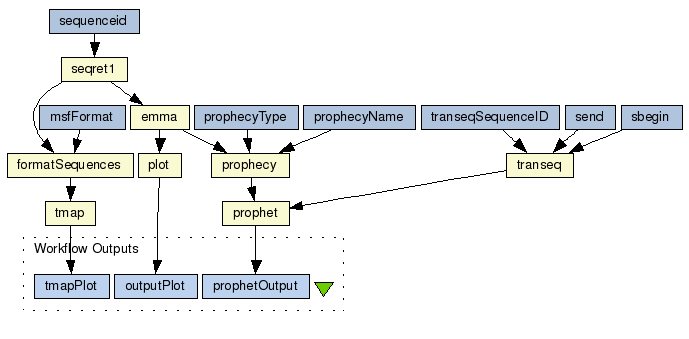 Designed to show the use of EMBOSS based Soaplab services from Taverna, this workflow has no inputs as all initial values are specified as string constants. A sequence set is fetched using the seqret tool, then simultaneously scanned for predicted transmembrane regions and subjected to a multiple alignment using emma. This alignment is then plotted to a set of PNG images and also used to build a profile using the prophecy and prophet tools.
