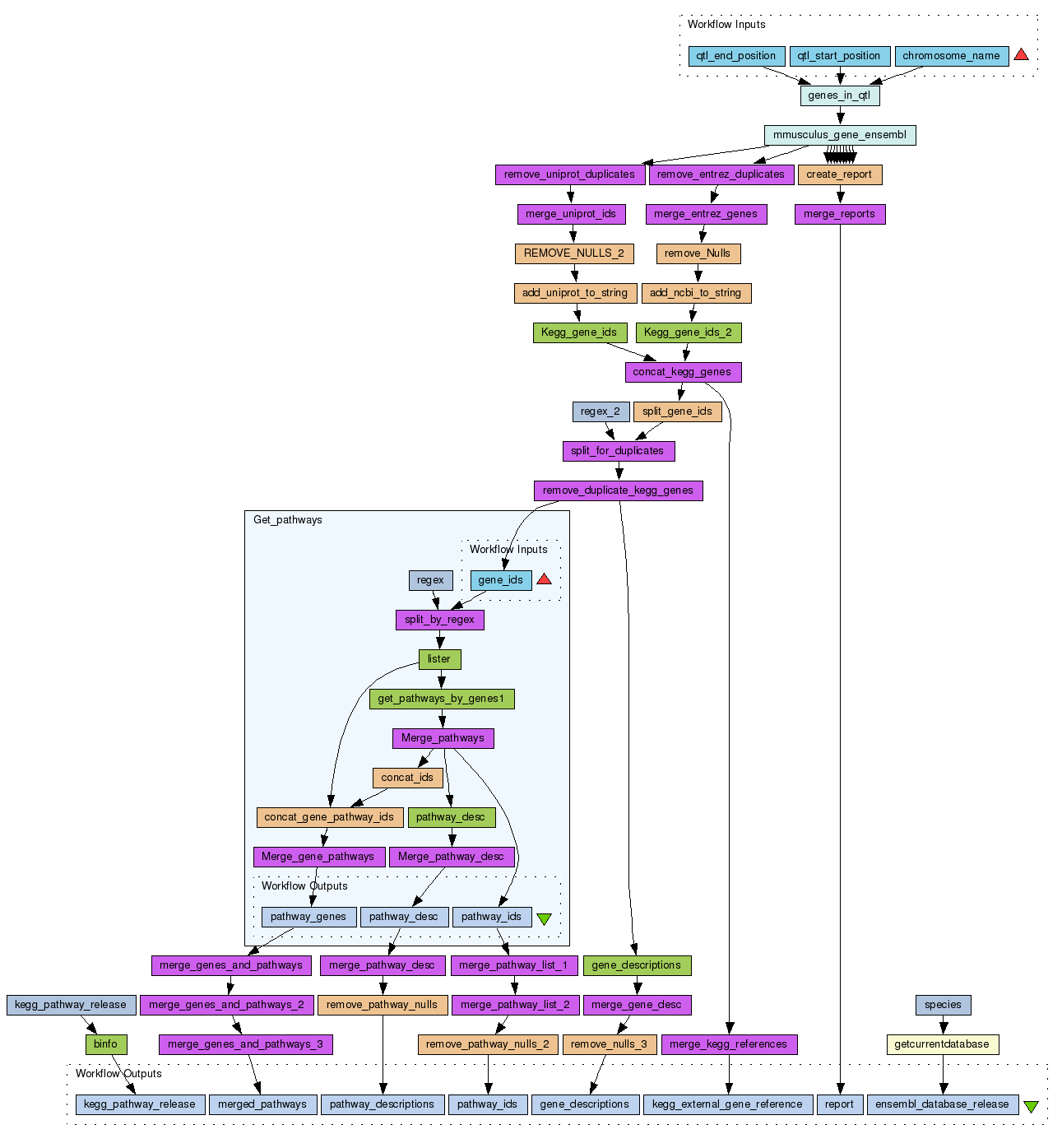 This workflow searches for genes which reside in a QTL (Quantitative Trait Loci) region in the mouse, Mus musculus. The workflow requires an input of: a chromosome name or number; a QTL start base pair position; QTL end base pair position. Data is then extracted from BioMart to annotate each of the genes found in this region. The Entrez and UniProt identifiers are then sent to KEGG to obtain KEGG gene identifiers. The KEGG gene identifiers are then used to searcg for pathways in the KEGG pathway database.