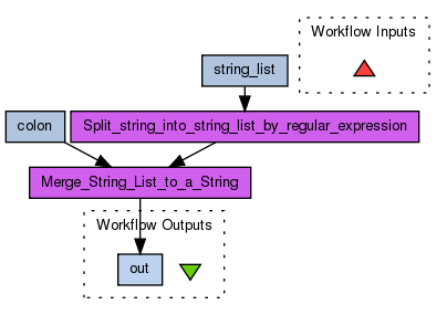 The merge string list to string service takes the list ['a','b','c'] and using the separator ':' outputs the string 'a:b:c'.