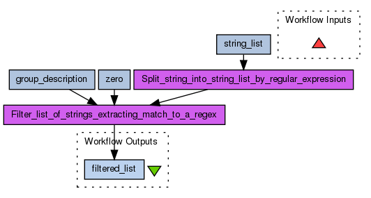 The workflow examines the five element list split from the first service. For each element, if it contains an 'a' followed by two characters, then that triple is included in the output. Thus, for the input ['a','b','abcde','cdef','axy'], only 'abcde' and 'axy' contain a match and so ['abc', 'axy'] is output.