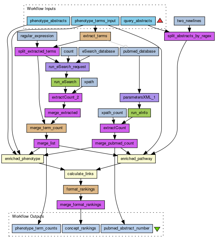This workflow counts the number of articles in the pubmed database in which each term occurs, and identifies the total number of articles in the entire PubMed database. It also identified the total number of articles within pubmed so that a term enrichment score may be calculated. The workflow also takes in a document containing abstracts that are related to a particular phenotype. Scientiifc terms are then extracted from this text and given a weighting according to the number of terms that appear in the document. The higher the value the better the score. This is given as: X = log((a / b) / (c / d)) where: a = number of occurnaces of individual terms in phenotype corpus b = number of abstracts in entire phenotype corpus c = number of occurnaces of individual terms in entire pubmed d = number of articles in entire pubmed Once this has been created, the pathways obtained from the QTL and microarray pathway analysis workflows are analysed. The documents from a search of each pathway in pubmed are merged into a single document of pathway abstracts. The (unweighted) phenotype terms are then searched in the pathways corpus. This will determine if the phenotype term is listed with the given pathway. The higher the value the better the score. Each term is then assigned a weight as: Y = log((e / f) / (c /d)) where: a = number of occurnaces of individual terms in pathway corpus b = number of abstracts in pathway corpus (per pathway) c = number of occurnaces of individual terms in entire pubmed d = number of articles in entire pubmed The weighted terms are then given a link score. This is the total of: X + Y. This gives the link between the pathway and the phenotype a score / significance value. The higher the score the more "appropriate/interesting" the link between the pathway and the phenotype. The terms are also ranked according to the number of pathways which have been given a weight. This is calculated as: W = Sum( X + Y). The higher the value the better the score.