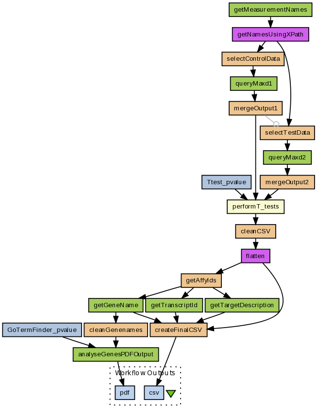 This workflow starts by retrieving the names of microarray datasets from the maxdLoad2 database. The user has to select sets of control and test data for analysis using t-tests by R. A list of significant differentially expressed genes is then analysed using the Go Term Finder tool which generates a PDF file containing list of common GO terms associated with the genes. A CSV file containing the list of significant genes is also generated.