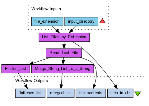 This workflow reads files from a given directory, based on a known file extension (e.g. .txt), and then outputs the contents of each file in a single value/single list. |