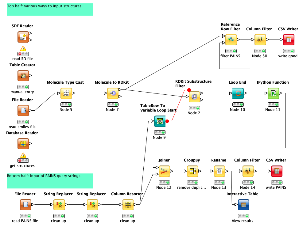 Implementation of the PAINS filters[1] using the RDKit (1.0.0.0000763) nodes in KNIME (2.3.1). Original PAINS filters were published in SLN format. This workflow contains the SMARTS form of the filters published by the Guha group[2]. Also distributed with a 10k reference structure set from WEHI[1] which is used by default as input if no other file is chosen.